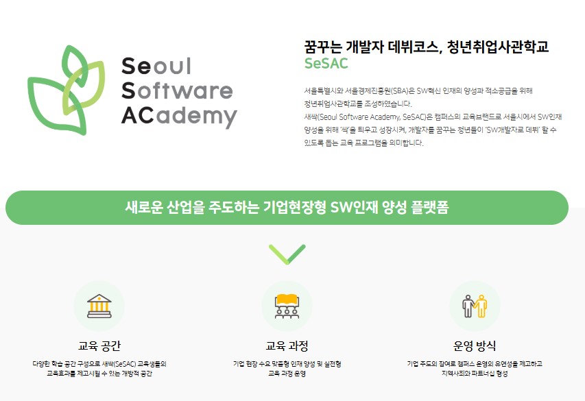 SeSAC은 서울시에서 운영하는 청년취업사관학교로, 청년들이 취업에 필요한 기술과 지식을 습득할 수 있도록 돕는 기관입니다. 이곳에서는 소프트웨어 개발, 데이터 분석, 디지털 마케팅 등 다양한 분야의 교육을 제공하고 있습니다. 특히, 실무 중심의 교육을 통해 청년들이 실제 기업에서 필요한 역량을 기를 수 있도록 지원하고 있습니다.